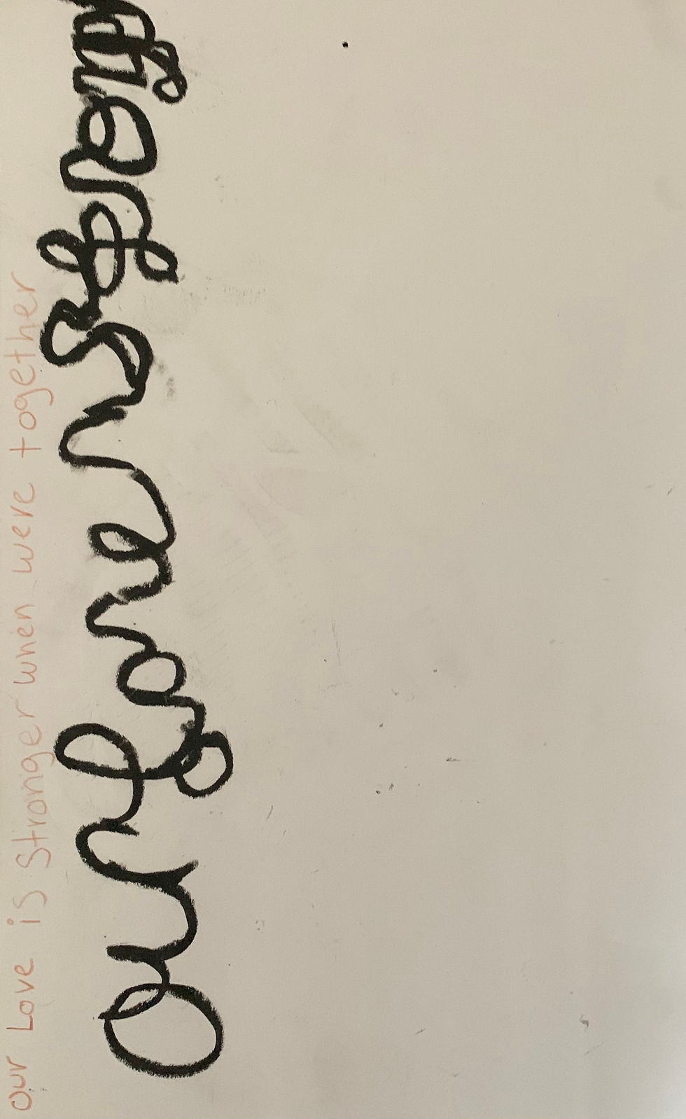 The piece features bold, looping black letters spelling out the word “ourselves” vertically across the page. The letters are thick, hand-drawn, and slightly uneven, giving the artwork a raw, heartfelt feel. Alongside the large black lettering, a softer message is written in red: “our love is stronger when we’re together.” The delicate handwriting contrasts with the bold strokes, creating a balance between strength and tenderness.